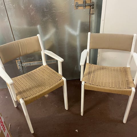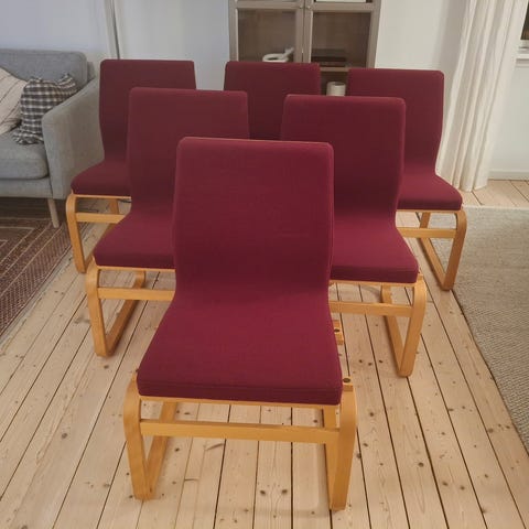 6 stk lyserøde spisestuestole med fletsæde. God stand. Sælges samlet.