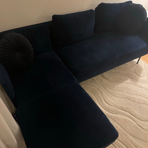 Blå sofa i velour materiale med sorte ben. Sofaen har to ryglænspuder og armlæn på begge sider. Passer til stue eller opholdsrum.
