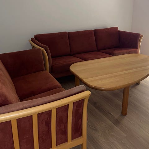 Velholdt sofagruppe fra Buehøjgård Møbler. Møblerne er kvalitetsmøbler i massiv bøg. De er ældre, men står velholdte og flotte.