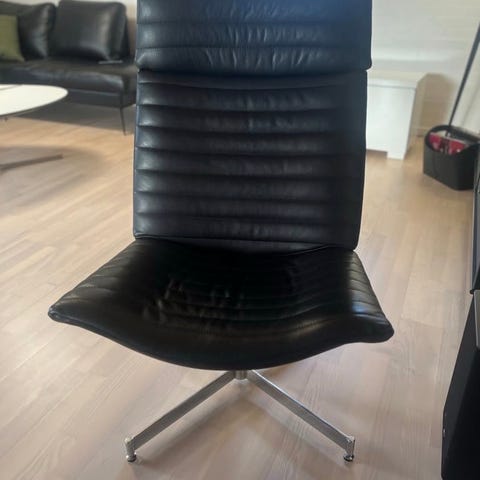 To vintage KEBE Eagle loungestole. Stolene har stel i krom og sæder i sort læder. De fremstår i flot vintagestand, hvor læderet er patineret på den fede måde. Ingen huller, ridser eller syninger som er gået op. Siddekomforten er god og designet enkelt og lækkert. Pris pr stk 2250 kr eller samlet for 4000 kr. stolene skal afhentes i Fredericia