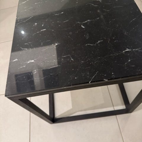 Lille fint sofabord eller sidetable. Model Cube, Designet af Kristina Dam. Rosa marmor, og massiv egetræ stel. Det var svært at fange farven, på nogle billeder ser det nærmest orange ud. Det er de billeder i lyset fra vinduet der gengiver farven bedst. Ny pris 2999 kr, sælges for 700 kr.