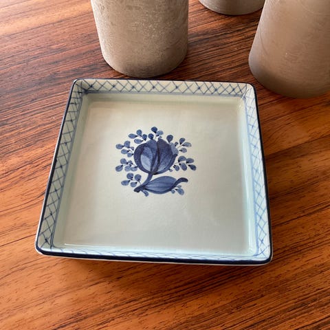 Copenhagen Desiree fad og tallerken sæt med blå mønster. Sættet indeholder forskellige størrelser fade og tallerkener, alle med et karakteristisk blåt blomsterdesign på hvidt porcelæn.45stk