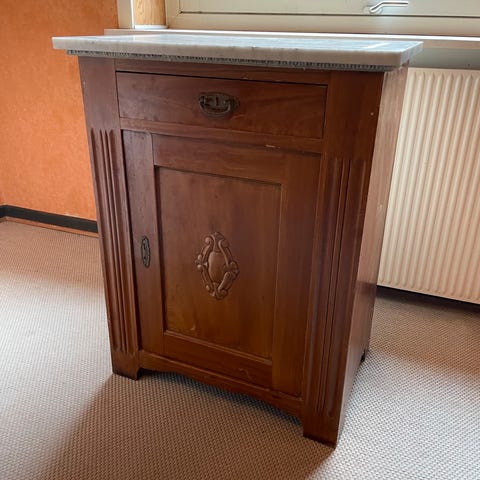 Smukt og solidt natbord/skab i massivt træ med ægte marmorplade sælges.