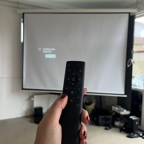 Lækker hjemmebiograf, projektor og lærred. Projektoren har hængt i ikke-ryger omgivelser, lampen er ca. 3 år gammel, har været brugt meget lidt.
