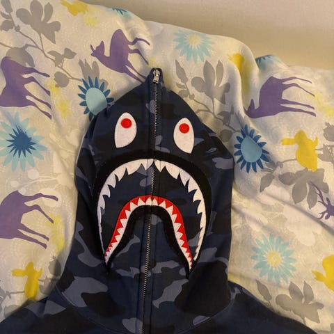 Central cee Syna World Hoodie i blå farve, størrelse L til herrer (passer M). Fremstillet i bambusviskose materiale, som giver blødhed og komfort. Hoodien har en stor frontlomme. Der står BAPE på titlen, da DBA ikke har Syna world som en mulighed😁