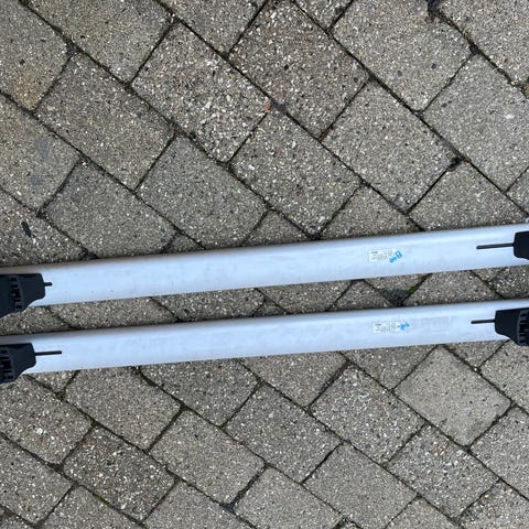 Tagbøjler som passer til åbne tagrælinger som f.eks. stationcars m.m. Tagbøjlerne har greb så de passer til mange forskellige biler. Bøjlerne har været brugt 5 gange.