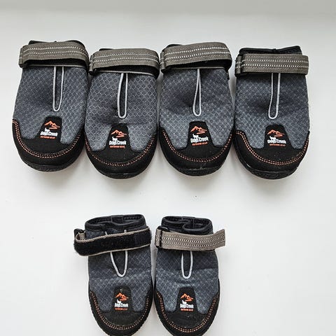 Helt ubrugte hundesko, kun prøvet på hund (for store), str. S-M, vandtætte, med refleks.