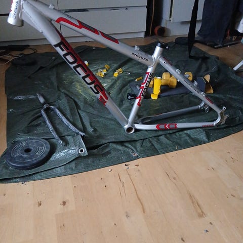 Cykelstel til selvbygger. Aluminiumsstel til 29" MTB hjul. Til skivebremser. Stellet er helt intakt. Pæn i lakken, bortset fra nogle afskrabninger hvor frontklingen har siddet - men du vil jo formentlig alligevel male hele stellet..