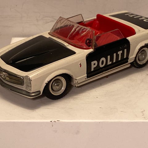 Mercedes-Benz 280SL Cabriolet modelbil i hvid med rød interiør. Modellen har åbne døre og kabriolet tag. Fremstillet i metal med detaljeret undervogn. Mangler lidt som det kan ses, rat, sideruder men det originale reservehjul er med, original lak.