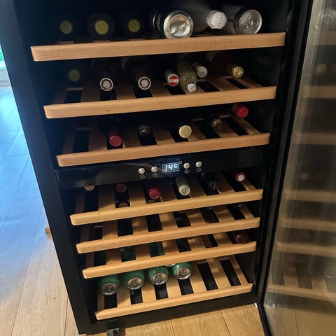 2 zoner til både hvidvin og rødvin. Med 5 udtrækshylder i træ. Justerbar fødder med max højde på 89cm. Plads op til 30-40 flasker. Kun afhentning.
