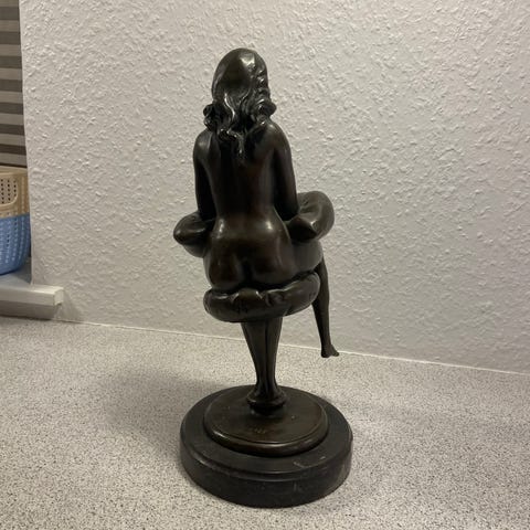 Bronzeskulptur forestillende en kvindelig figur i en liggende stilling på alle fire, placeret på en sort base. Skulpturen har detaljeret fremstilling af kroppen og håret.