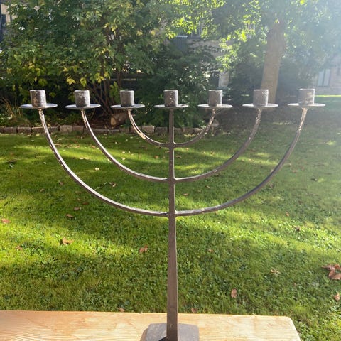 7 Armet lysestage, Flot jern lysestage med 7 arme sælges. Den er 38,5 cm høj og har en diameter på 30 cm. Har alm slitage efter 50 års brug.