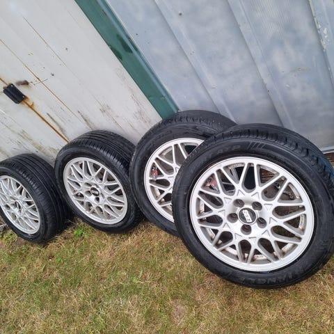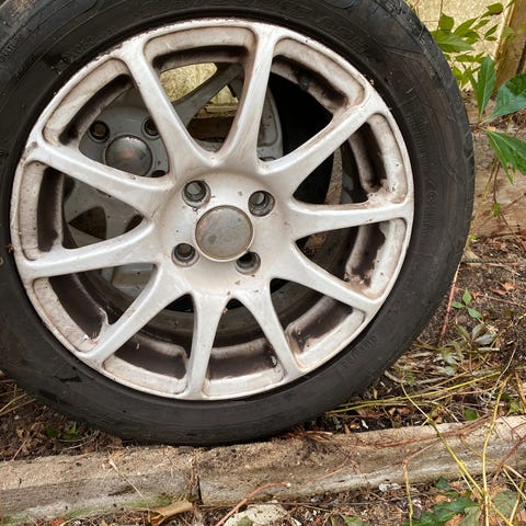 Der sidder dæk på fælgene, men de er slidte og medfølger udelukkende – salget er kun af fælgene.