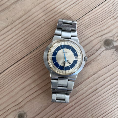 Omega Polaris herreur med stållænke og sort urskive. Uret har en rund urskive med minimalistiske timeindikatorer og en kombination af guld stål på kassen og lænken. Designet er klassisk og velegnet til daglig brug.