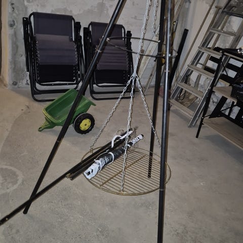Bålsted Tripod Bålsted Tripod Grill med stativ i sort metal. Grillen er designet til udendørs brug over åben ild og kan bruges til madlavning med pølser, kød eller andre grillvarer. Tripod-designet gør det muligt at hænge grillristen i forskellige højder over bålet.