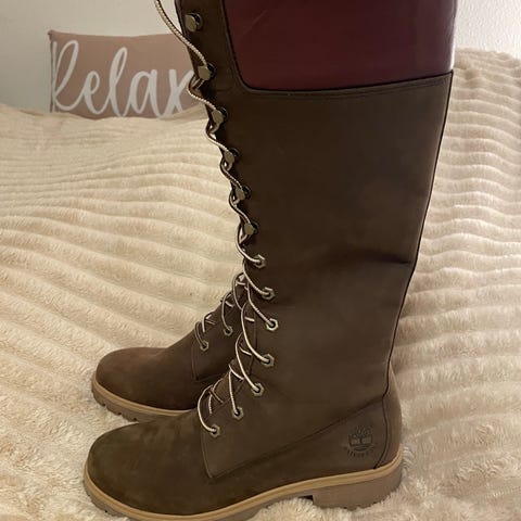 Timberland støvler i størrelse 37. Støvlerne har snørelukning og en kilehæl. Indvendigt foret med blødt materiale for ekstra komfort. Farven er lys brun/beige.