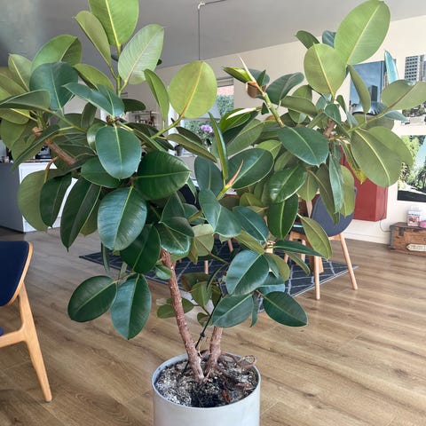 Flot stort gummitræ, 180 cm højt og 150 cm bredt. Det skyder nye blade hele tiden. Fast pris! Kan leveres i Kbh. Krukke medfølger ikke!