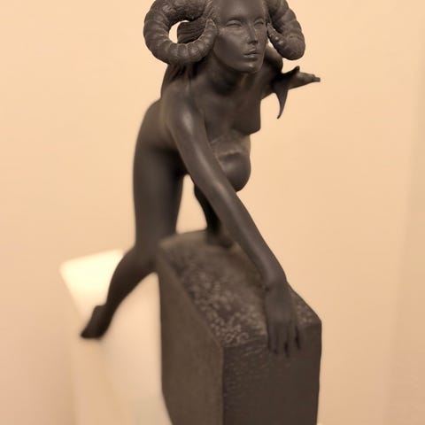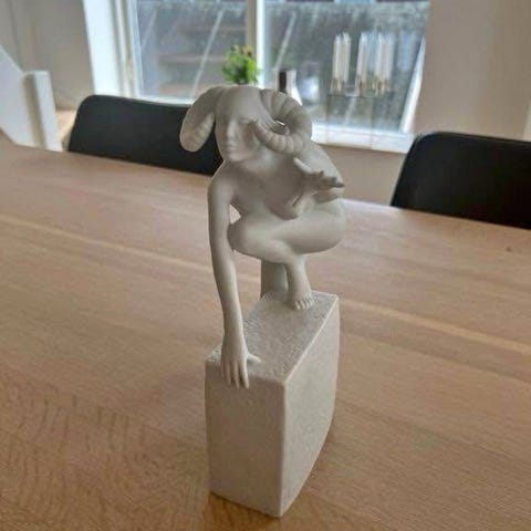 Royal Copenhagen Aries figurine med design af Christian Thomsen. Fremstillet i porcelæn med detaljeret formgivning af et væsen med vædderhorn. Figuren er hvid og står på en firkantet base.