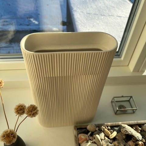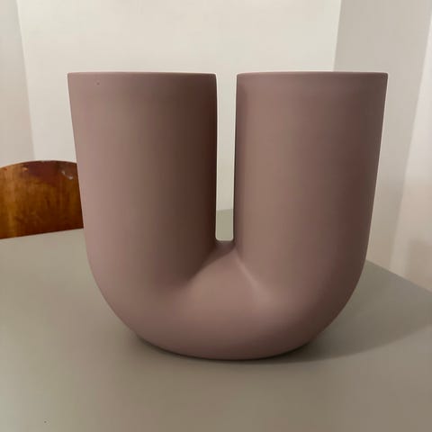 Muuto dobbel vase i farven Dusty Lilac. Vasen har et unikt design med to sammenhængende beholdere, hvilket giver mulighed for kreativ blomsterarrangering. Fremstillet i keramik med en mat finish. Højde 27 cm.