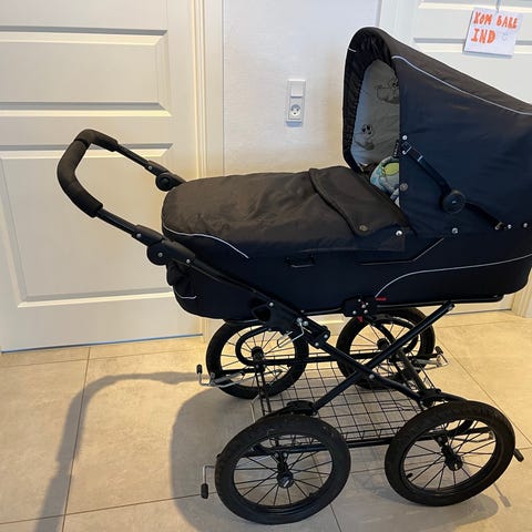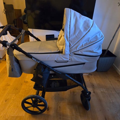 Trille barnevogn med beige farve og sort stel. Indeholder kaleche, liggedel og tilhørende taske. Designet til at give komfort og funktionalitet ved transport af små børn. Brugt meget lidt til 1 barn