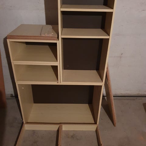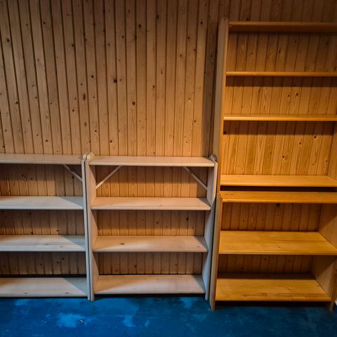 Vintage reol i lakeret fyr. Reolsystemet kan sammensættes med andre moduler fra Boghandlernes byggereoler. Har stået indendørs i røgfrit hjem. Sættet består at fire moduler. Tre reoler med tre hylder samt et skabsmodul. Nypris for hele sættet ca. 6.800 kr.