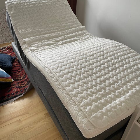 Et næsten usynligt mærke (lidt spildt te) på den ene side af topmadrassen er eneste tegn på brug.