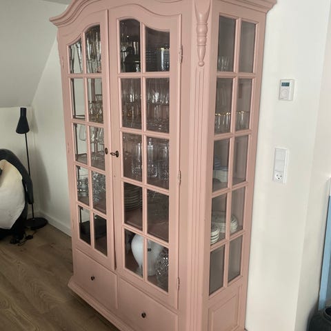 Vitrineskab i afsyret fyrretræ med glas låger foroven og skab i bunden