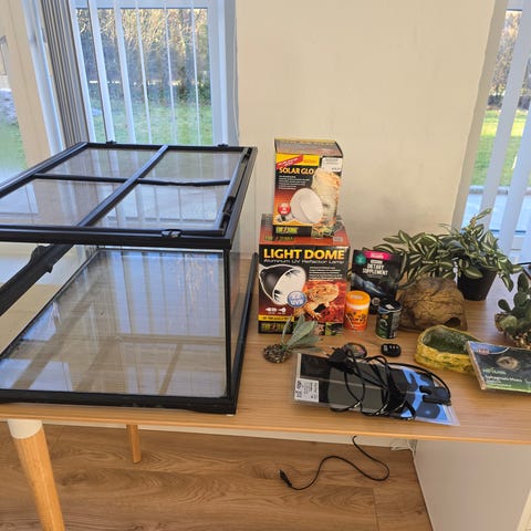 Terrarium inkl. bundvarmeplade. Der er skader på bagpladen og toppen er lidt smeltet lidt efter en varmelampe. Se billeder. Har været brugt til skægagame. Ny værdi 1.800kr.