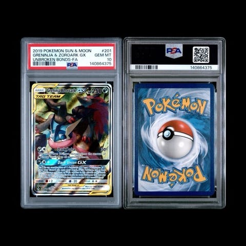 Pokémon TCG Tool Scrapper GX spillekort med illustration. Kortet er indkapslet og vurderet af PSA med et vurderingsnummer 106892220. Kortet er sjældent og har en værdi på 250€.