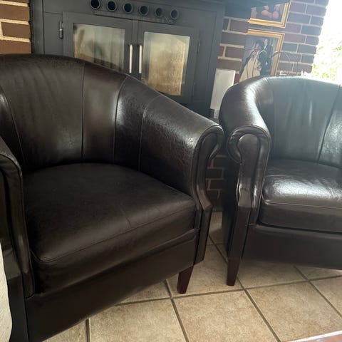 Sælger disse to loungestole / lænestole fra ILVA i flot cognacfarvet læderlook.