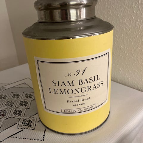Smuk og iøjnefaldende original te-dåse fra Bellocq Tea Atelier, mærket No. 31 Siam Basil Lemongrass – Organic. Dåsen er fremstillet i metal med låg og har et elegant, klassisk design i gul med sort/hvid etiket.