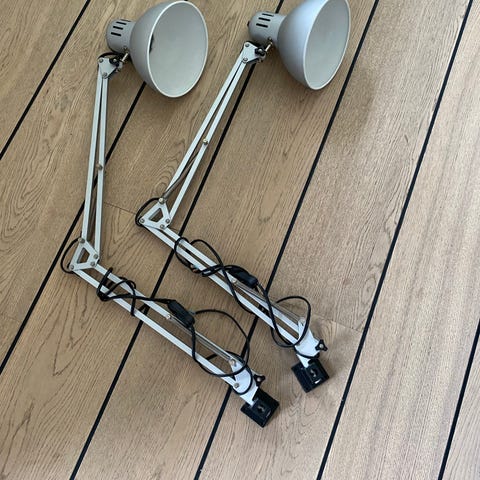 Skrivebords lampe eller væglampe. Koksgrå. Der følger både væg beslag og beslag til bord med. I fin stand - meget anvendelig - har to stk - nypris 120kr - sælges for 50kr pr stk