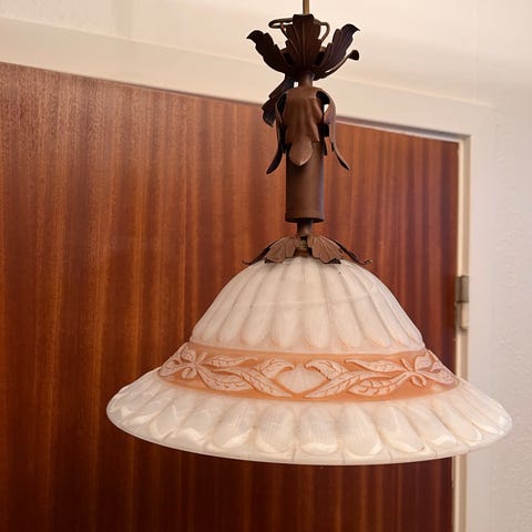 Flot rød pendellampe som er perfekt til køkkenet i lejligheden eller over spisebordet. Den har ægte patina og har synlige rustpletter. Den har absolut noget alder på sig, men ved ikke hvornår den er fra. Jeg har haft den i 20 år. Den har en diameter på 34,7 cm. Den har 2-3 M ledning monteret. Pæren virker og følger med.