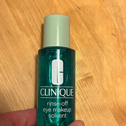 Clinique Rinse-Off Eye Makeup Solvent. Produkt til fjernelse af øjenmakeup. Indeholder 60 ml væske i en flaske med grøn hætte.