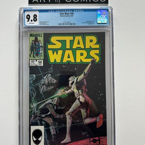 Første udgave, en vurderet Star Wars-tegneserie fra Marvel Comics, nr. 75 (1983), CGC 9.8 Mint, hæftet binding, illustratører Ron Frenz, Tom Palmer og Mary Jo Duffy. Klik på den blå "gå til varen" knap, for at købe eller byde på denne vare. Den samlede pris vil blive vist inden du afgiver dit bud.
