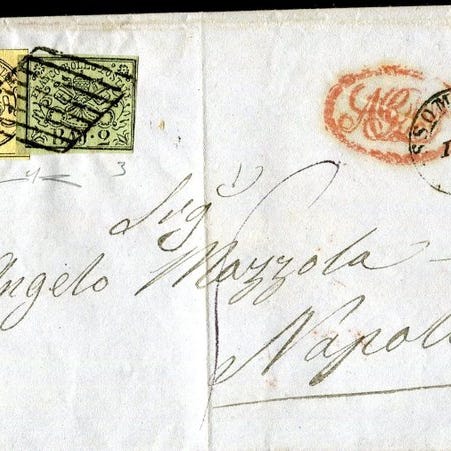 Fra de Pavestaterne, 1867, 5 centesimos azur/grøn, fire brugte eksemplarer med rombiformede Roma-stempler; tiltænkt postforsendelse; certifikat inkluderet. Klik på den blå "gå til varen" knap, for at købe eller byde på denne vare. Den samlede pris vil blive vist inden du afgiver dit bud.
