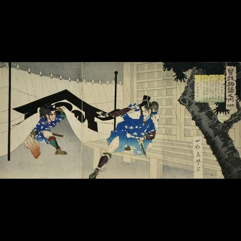 Havet raser, vinden strejfer hans kimono, men alt forbliver underligt fredeligt — som om verden holder vejret.