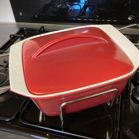 Cocotte i emailleret støbejern, rød på ydersiden og hvid indvendigt, med et originalt og sjældent design.