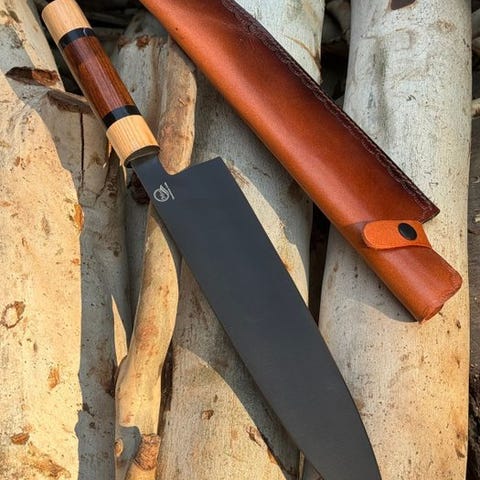 Bladmateriale: Premium Damascus 10/95 15N20, pod cod Black Chef Knife – Træhåndtag med lædercover.