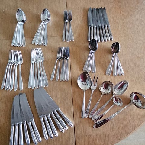 Tungt sølvbelagt (keltum) bestikketsæt til 10 personer med serveringsbestik