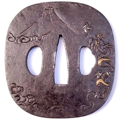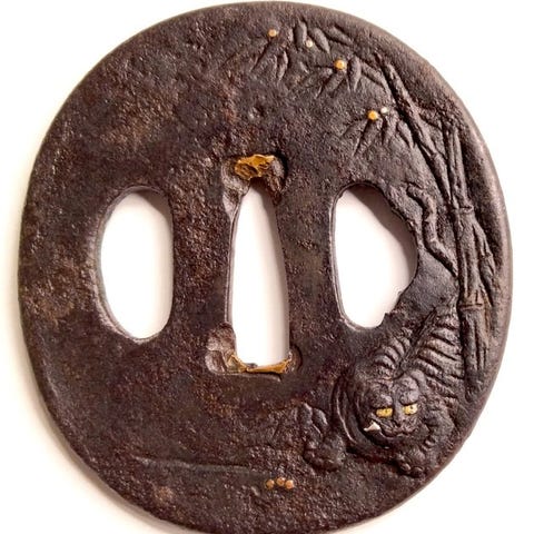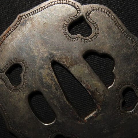 Tsuba fra midten af Edo-perioden med messing-kobber inlæg og hasibladsmotiv, 82x80x4 mm, nakago 28x9 mm, vægt 150 g, oprindelse Japan, med NHKK-certifikat. Klik på den blå "gå til varen" knap, for at købe eller byde på denne vare. Den samlede pris vil blive vist inden du afgiver dit bud.