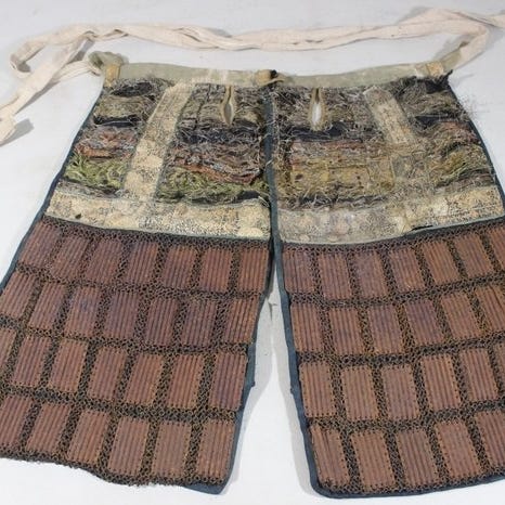 Forged jern Yoroi-dou, to plader, fra Edo-perioden (over 200 år gammel), Japan, malet sort og brunt, vægt 4,3 kg, i rimelig stand. Klik på den blå "gå til varen" knap, for at købe eller byde på denne vare. Den samlede pris vil blive vist inden du afgiver dit bud.