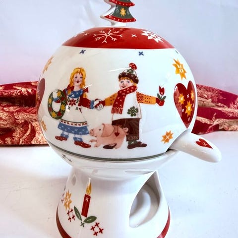 Franz Porcelain julemiddagscenterstykke i form af et grantræ dekoreret med misteltenblade og to fugle, porcelæn, hvid, Art Déco stil, fremstillet af Franz Porcelain (Frankrig), ca. 2001, i næsten ny stand. Klik på den blå "gå til varen" knap, for at købe eller byde på denne vare. Den samlede pris vil blive vist inden du afgiver dit bud.