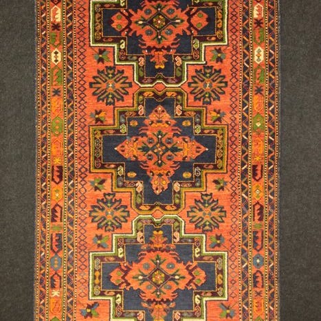 Karabagh-tæppe i caucasisk blomsterstil, fremstillet med Kilim-teknik og dekoreret med to store styliserede blomsterkurve på mørk baggrund. De livlige farver – rød, rosa, gul, grøn – skaber en elegant kontrast til den geometriske og blomsterdekorative kant. Mønstret er symmetrisk og rigt på detaljer, hvilket er typisk for den tekstile tradition i det sydlige Kaukasus.