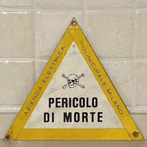 Original italiensk rygeforbudsskilt 'VIETATO FUMARE', lavet af metal, med klassisk grafik af den røde gennemstregede cirkel og pibe. Genstanden har en behagelig patina fra tiden, med rust, ridser, misfarvninger og brugsspor, der vidner om dens ægthed. Der er huller i hjørnerne til fastgørelse, og kanten er let bøjet nogle steder. Bagsiden er fuldstændig oxideret, hvilket er i overensstemmelse med alder.