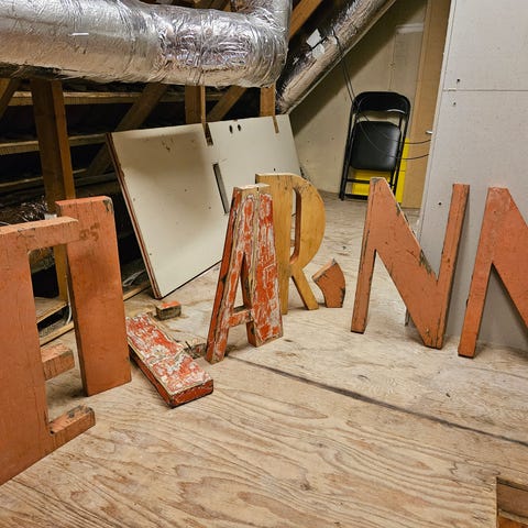 En original træbogstavrække fra en erhvervsorienteret trykkeri. Anslået fra perioden 1940. I god brugt stand. Materiale træ. Næsten intakt, nogle af delskufferne er fjernet, sandsynligvis til at adskille bogstaverne. På skufferne er der med blyant skrevet, hvilke bogstaver de skulle indeholde. Med jernhåndtag og metalnavneskilt. Bredde 66 cm. Højde 50,5 cm. og dybde 5,5 cm. Vægten er 3,6 kg. Smuk som vægdekoration, men også egnet til opbevaring. Genstanden sendes godt pakket og er sporbar. Ingen forsendelse til USA.