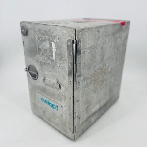 De XL-enhed med hjul er lavet af en original ny galley-container i originalt format og sølvfarvet anodiseret aluminium.