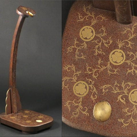 Forfineret træsværdestativ med perlefarvede blomster på begge sider, model Refined wooden Sword stand 刀掛け (Katana’kake), der kan rumme tre sværd, fremstillet i Japan, ca. 1970–2000, dimensioner 54 x 20 x 40 cm, vægt 2,4 kg, i god brugt stand med tegn på slitage. Klik på den blå "gå til varen" knap, for at købe eller byde på denne vare. Den samlede pris vil blive vist inden du afgiver dit bud.