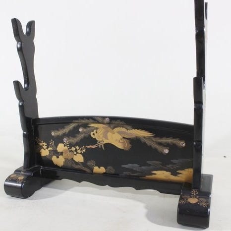 Forfinet træsværdestativ indlagt med smukke blomster lavet af perlemor på begge sider af fremragende håndværk, kan rumme tre sværd samtidigt.