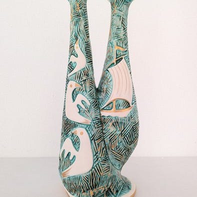 Super par af harmoniserede vaser, fremstillet af fabrikken SICAS – Società Italiana Ceramica Artistica Sestese, aktiv i Sesto Fiorentino nær Firenze, i anden halvdel af det 20. århundrede.